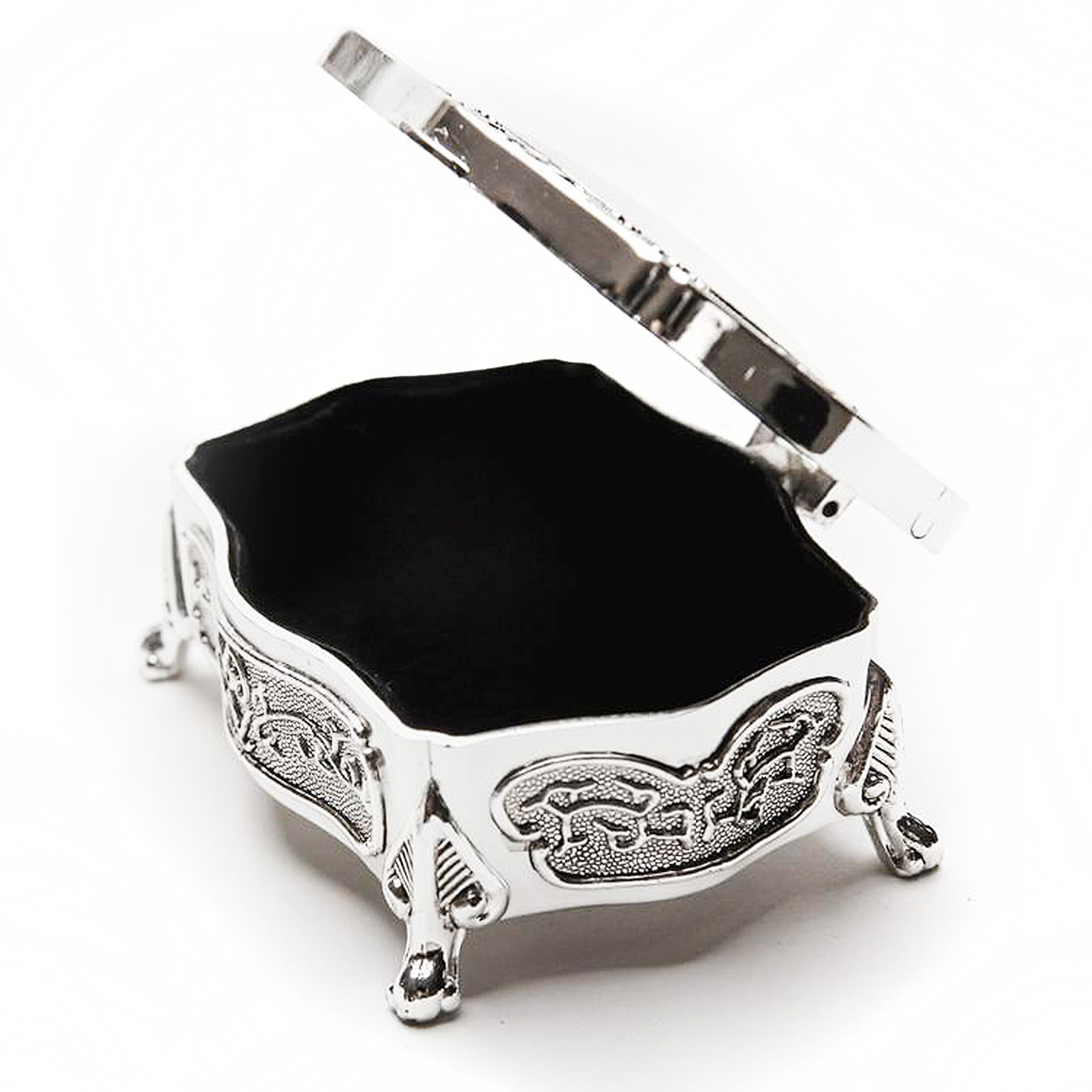 Díszes ezüst színű ékszertartó plüss béléssel.